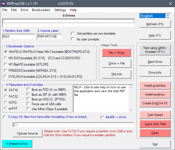 Головною метою RMPrepUSB є створення завантажувальних USB-дисків. Це програмне забезпечення також має спеціальним інструментом, який швидко перевірить реальний обсяг пам'яті підключеного USB-девайса. Слід звернути особливу увагу на те, що проведене даною утилітою тестування видаляє всю інформацію, що зберігається на диску.