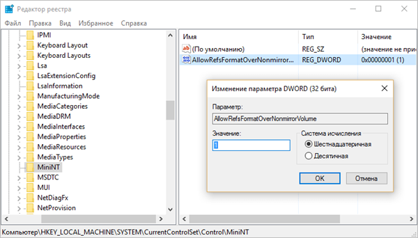 Зате в Windows 10 / 8.1 можна прямо зараз оцінити всі принади нової файлової системи, через відповідний Твік реєстру (в розділі HKEY_LOCAL_MACHINE \ SYSTEM \ CurrentControlSet \ Control \ FileSystem створіть параметр DWORD з ім'ям RefsDisableLastAccessUpdate і значенням "1" + в розділі HKEY_LOCAL_MACHINE \ SYSTEM \ CurrentControlSet \ Control створіть підрозділ MiniNT з параметром DWORD під ім'ям AllowRefsFormatOverNonmirrorVolume і значенням "1", на скріншоті).