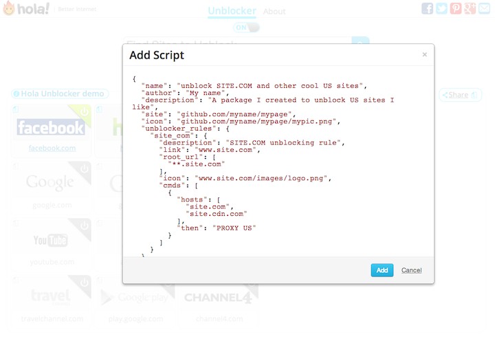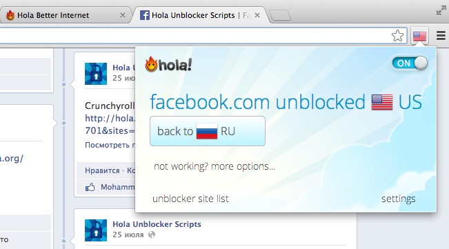 Разблокировщик Hola є безкоштовний VPN-сервіс з декількома попередньо скриптами для сайтів з потоковим відео. вивчивши прикладену документацію , Можна написати скрипт практично для будь-якого веб-сайту. Крім того, на Facebook є спеціальна група , Де викладаються нові скрипти для розблокування самих різних сайтів.