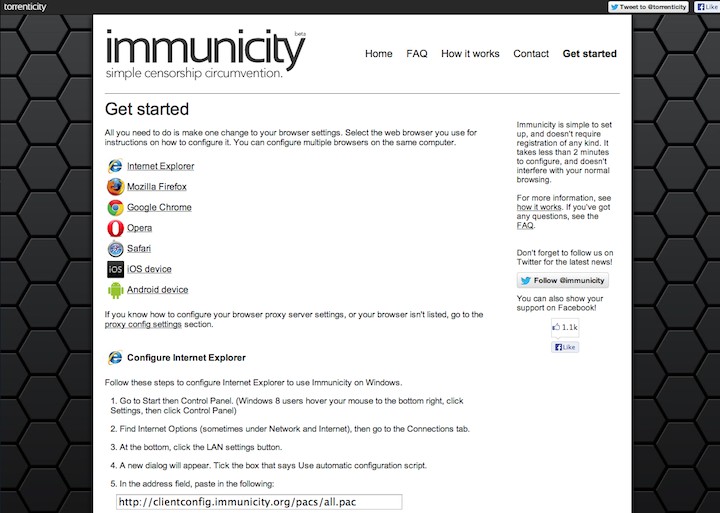 Наприклад, можна скористатися PAC-файлом безкоштовного сервісу Immunicity , В списку якого вже фігурують найпопулярніші російські трекери rutracker.org і rutor.org. Творці сервісу особливо обговорюють, що вони гарантують проходження через свій проксі тільки адрес, внесених до списку, - щоб уникнути підвищеного навантаження.