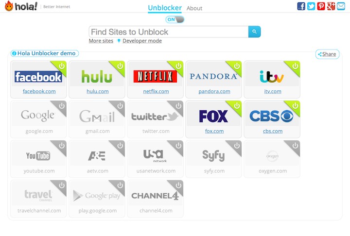 Безкоштовний плагін для браузерів Internet Explorer, Chrome і Firefox, а також мобільної операційної системи Android не тільки дозволяє заходити на недоступні у вашій країні Медіасервіс, але і прискорює завантаження сторінок і іншого контенту (не працює в Mac OS X). Таке прискорення здійснюється за рахунок схеми роботи Hola: дані під час перегляду кешуються на машинах бенкетів з встановленим плагіном, які при запиті передають їх на найближчу машину в мережі. Чим більше користувачів Hola в вашому районі, тим швидше вантажаться сторінки.