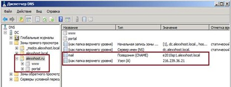 - CNAME - mail вказує на вузол e2010 sp1. alexxhost. local